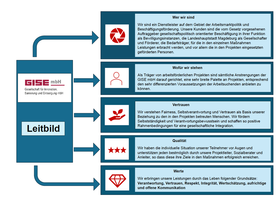 Gegenstand des Unternehmens ist - auf der Grundlage der gesetzlichen Regelungen gemäß SGB II und SGB III - die Reintegration durch Beschäftigung und Qualifizierung von Arbeitslosen, von Arbeitnehmern, die von Arbeitslosigkeit bedroht sind sowie von Sozialhilfeempfängern und Arbeitsuchenden unter besonderer Berücksichtigung der Integration von Frauen, Behinderten, Jugendlichen, älteren und schwer vermittelbaren Personen. Der Gegenstand soll hauptsächlich erreicht werden durch Planung, Anbahnung, Vorbereitung, Koordinierung und Durchführung von Projekten im öffentlichen Interesse als Maßnahmeträger oder Betreuer in Anwendung der gesetzlichen Regelungen sowie unter Nutzung weiterer gegebener Fördermöglichkeiten, insbesondere auch durch intensive Zusammenarbeit mit regionalen Wirtschaftsunternehmen und durch Kooperation mit anderen Sozialbetrieben. Sämtliche Anstrengungen der GISE sind darauf gerichtet, eine sehr breite Palette an Projekten, entsprechend der sehr differenzierten Voraussetzungen der Arbeitsuchenden anbieten zu können. Das ist der Beitrag der GISE, der nach wie vor hohen Arbeitslosigkeit entgegenzuwirken, Arbeitsuchenden ein Betätigungsfeld und eine Perspektive zu bieten sowie zur Verbesserung des Gesamtoutfits und der touristischen Infrastruktur der Landeshauptstadt beizutragen.